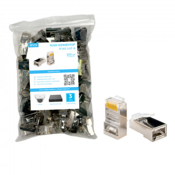 RJ45-3UF-6 EVO — FTP-коннектор категории Cat6 с позолотой 3U, предназначенный для экранированных линий в условиях повышенных помех; совместим с монолитным и многожильным кабелем, упаковка 100 шт.